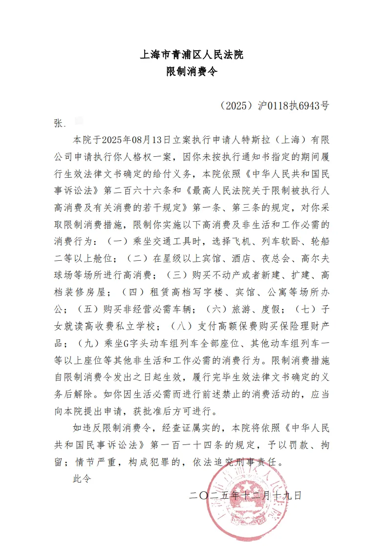 新京报贝壳财经讯(记者 余金明)近日,上海青浦区人民法院下达的限制消费令显示,一名女子“就在天台上”认领特斯拉汽车,被法院采取限制消费措施。理由是张先生未在执行通知书规定的期限内履行有效法律文件规定的付款义务。申请人为特斯拉(上海)有限公司。根据法院诉讼程序,今年8月,张某被要求执行约17.23万元。 12月31日中午,一位支持特斯拉“屋顶维权”的汽车维权人士独家对北京贝壳财经报记者表示:“我刚刚看到消息,声誉诉讼已向上海高院重新审理。特斯拉也对数据诉讼提出上诉,目前正在进行二审。二审宣判后,我们将重新审理。”张女士坦言,限高条例对她在公众层面造成了一定影响,“尽快按照流程向法院缴纳,到期缴纳。”据此前报道,2021年4月19日,上海车展媒体日首日,一名特斯拉车主爬上车展特斯拉展示车车顶,大喊“特斯拉刹车失灵”,被保安带走。同一天,上海警方以扰乱治安罪对张某进行拘留五天。2021年2月,一名特斯拉车主的父亲在与自己的特斯拉发生追尾事故后,继续要求特斯拉提供完整的驾驶数据,但遭到拒绝,虽然交警认定张某的父亲对事故负有全部责任,但家人认为事故原因是刹车失灵。2021年10月,特斯拉(上海)有限公司对张某提起诉讼,要求特斯拉提供完整的驾驶数据。磨坊因上海车展“保顶”行为侵犯公司名誉权,赔偿人民币1万元。经过四年的诉讼,2025年7月11日,上海第二中级人民法院发布二审裁定,维持原判,裁定张某侵犯特斯拉名誉权,应向特斯拉赔礼道歉并支付约17万元赔偿金。 2025年9月16日,北京市大兴区人民法院对张先生与特斯拉汽车销售服务(北京)有限公司销售合同纠纷诉讼作出裁定,认定特斯拉作为企业主必须保护消费者的知情权,并责令张先生提供事故发生前30分钟的完整驾驶数据。 12月31日,张官员告诉新京报贝壳财经记者,特斯拉目前尚未提供完整数据。编辑陈莉 校对陈迪彦