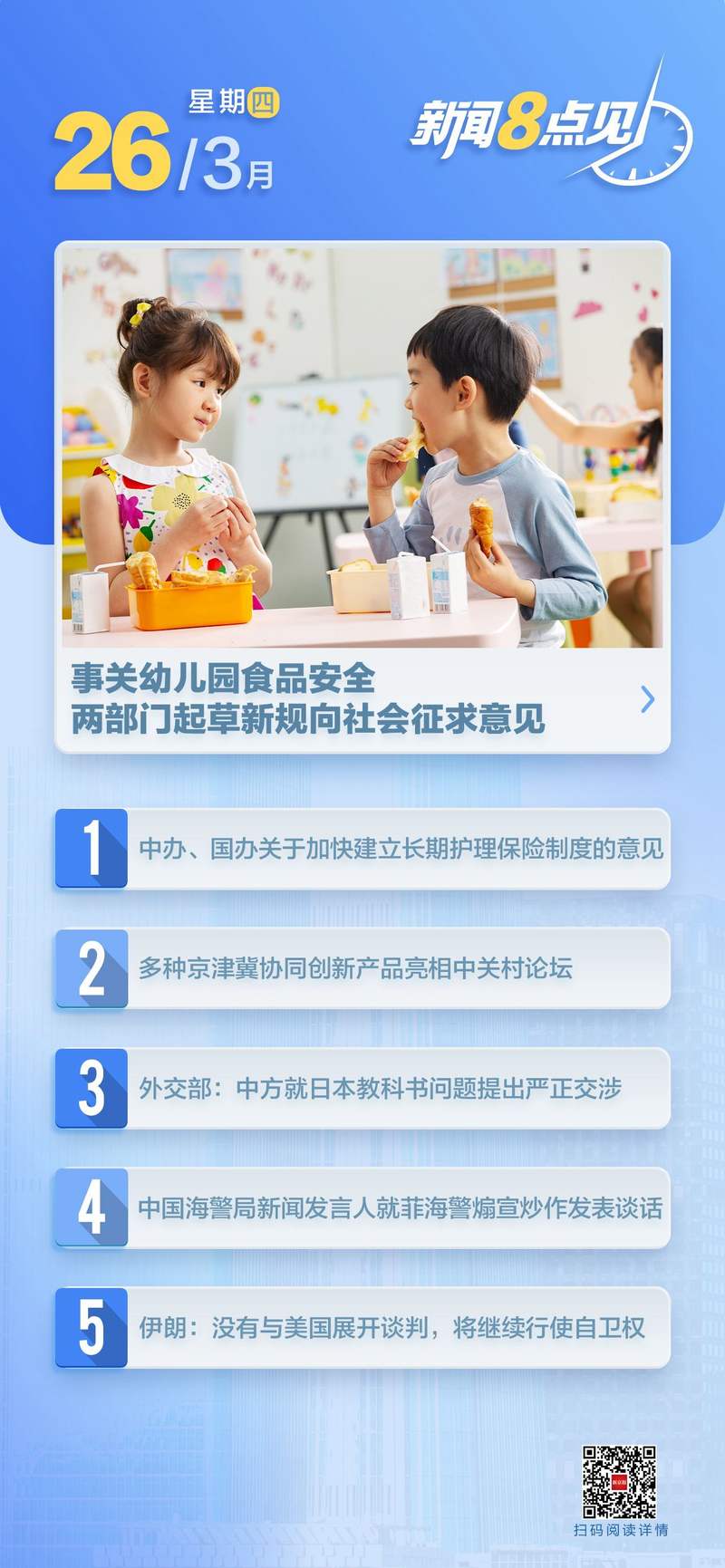 【时政】丁薛祥出席2026中关村论坛年会开幕式并讲话。 2026中关村论坛年会25日在北京开幕。中共中央政治局常委、国务院副总理丁薛祥出席开幕式并讲话。 (新华社)阅读全文>>>王毅同土耳其外长费丹通电话 2026年3月25日,中共中央政治局委员、外交部长王毅同土耳其外长费丹通电话。 (央视新闻)阅读全文>>> 王毅同埃及外长阿卜杜勒·阿蒂通电话 2026年3月25日,中共中央政治局委员、外交部长王毅同埃及外长阿卜杜勒·阿蒂通电话应阿卜杜勒·阿蒂的请求,处理埃及事务。 (央视新闻)阅读全文>>>中共中央办公厅、国务院办公厅关于加快建立长期护理保险制度的意见25日,中共中央办公厅、国务院办公厅公布了关于加快建立长期护理保险制度的意见。 (新华社)阅读全文>>> 关于幼儿园食品安全,两部门正在起草新规定,向社会征求意见。近日,市场监管总局、教育部拟起草《幼儿园食品安全主体责任落实监督管理细则(征求意见稿)》(以下简称《征求意见稿》),并向社会公开征求意见30天。 《意见草案》《关于落实食品安全“四个最严要求”的通知》共32条,旨在落实食品安全“四个最严要求”,进一步强化幼儿园、承包企业、餐饮服务部门食品安全主体责任,切实保障儿童食品安全。(人民日报)阅读全文>>>2月份,全国共查处违反中央八项规定精神卫生问题案件16299起。3月25日,中央纪委、国家监委2026年2月,监察委公布了全国违反中央八项纪律精神问题查处方案。当月,共查处违反中央八项纪律精神问题案件16299起,批评教育和处分20350人,其中受到党纪处分14012人。政府。办公室工作。这是连续第 150 个月发布月度报告数据。 (中央纪委国家监委网站)阅读全文>>>窒息!一审认定谭瑞松犯贪污罪、受贿罪。他被判犯有受贿、内幕交易和泄露内幕信息罪。 2026年3月25日,辽宁省大连市中级人民法院以贪污罪、受贿罪、内幕交易罪、泄露内幕信息罪对中国航空工业集团公司原党组书记、董事长谭瑞松作出公开宣判。被告人谭瑞宗因贪污罪被判处有期徒刑15年,并处罚金500万元。他被判犯有受贿罪。被判处死刑,缓期二年执行,剥夺政治权利终身,并处没收个人全部财产。他被判处六年徒刑因内幕交易、泄露内幕信息入狱并处罚金,死刑缓期两年执行。继续追缴内幕交易违法所得。 (央视新闻)阅读全文>>> 四部门开展校园治安保卫行动 3月25日,教育部、应急管理部、市场监管总局、公安部联合启动2026年中小学、幼儿园全国治安保卫行动,要求各地聚焦重要任务,严格查处整改,全面提升校园治安能力和治理水平,坚决守住安全保卫的利润线和红线。稳定性。 (央视新闻)阅读全文>>> 外交部:中方就日本教科书出版问题作出严正声明 外交部发言人林健25日表示抹黑和贬低捏造历史事实、玩文字游戏,逃避教科书认证的历史责任,是日本否认、歪曲侵略历史的惯用手法。中方对此十分不满和坚决反对,并已向日方提出严格要求。 (央视新闻)阅读全文>>>外交部:再次要求日方立即调查强行进入中国驻日使馆事件。外交部发言人林坚25日在例行记者会上就3月24日日本犯罪分子闯入中国驻日本使馆事件答记者问。中国驻日本使馆正在配合日本警方做好后续处置,肇事者已移交日本警方。 “我们再次敦促日方立即彻查事件,严惩违法者,并向中方作出负责任的解释。”林健说。 (新华社)阅读全文>>>商务部:墨西哥对华进口商品加征关税等相关措施正在造成贸易和投资壁垒。 《中华人民共和国对外贸易法》与《对外贸易壁垒调查条例》的关系 根据规定,商务部于2025年9月25日发布2025年第53号公告,决定对墨西哥对华相关限制措施进行贸易和投资壁垒调查。现本次调查已结束,商务部根据调查结果和《对外贸易壁垒调查条例》第三十一条的规定,认定墨西哥政府对中国等非自由贸易伙伴提高进口关税等相关措施构成贸易壁垒,因《对外贸易壁垒调查条例》第三条规定的情形,不得进行投资。贸易)墨西哥对中国的限制性措施被认为是贸易和投资的障碍。商务部回应:3月25日,商务部发言人就墨西哥对华限制措施贸易和投资壁垒调查最终结果公布一事答记者问。 (商务部)阅读全文>>>中国海警发言人就菲律宾海警宣传发表声明。 3月25日,中国海警发言人就菲律宾海警宣传发表声明。中国海警发言人刘德军近日表示,中国海警定期在黄岩岛附近管辖海域开展维权执法培训,并发布了依法张贴航行安全告示。其间,菲律宾以“钓鱼”为名,集结大量船只进入中国训练海域,企图煽动炒作、误导国际注意力。我们敦促菲方立即停止煽动事端和夸大诽谤。中国海警将坚决依法在黄岩岛中国海域开展维权执法活动。维护国家领土主权和海洋权益。 (中国海警办公室)中菲执法部门合作遣返犯罪嫌疑人。近日,中菲执法部门合作遣返涉嫌组织他人非法越境的郑萌萌。调查发现,郑萌萌为了谋取个人利益,组织引导菲律宾人等国民非法入境,通过走私、骗签证等方式提供国内服务,造成非法停留、非法就业等问题,严重危害社会管理秩序。使馆敦促中介机构和个人规范招聘用工行为,不得从事以营利为目的的违法犯罪活动。 (中国驻菲律宾大使馆)【当地】“买全球,卖全球”,中关村国家2026年国际科技商贸大会开幕“加强科技和驿站服务人才队伍建设多项举措鼓掌”,科技经理人“蓝佳”蓝千计划启动,众